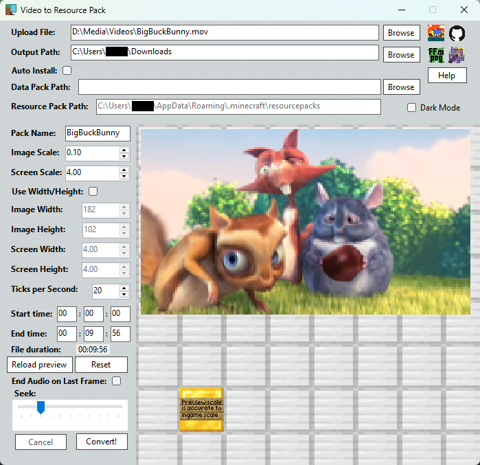 Choose the scale at which the video will be shown in Minecraft. You can use the preview to get it just right. (Note the slider in the bottom left to select different freeze-frames).